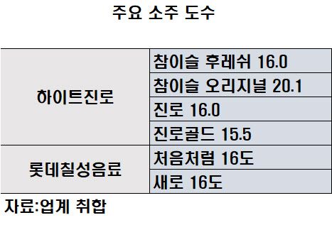 여기에 경쟁 제품인 하이트진로의 도수가 점점 낮아지는 것도 영향을 미쳤다. 하이트진로는 지난해 2월 ‘참이슬 후레쉬’를 16.5도에서 16도로 낮추는 리뉴얼을 단행했다. 하이트진로의 대표 소주인 ‘진로’는 16도, ‘진로골드’는 15.5도다.