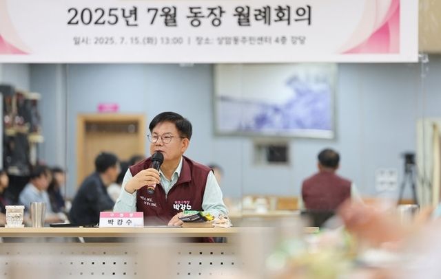 | ▲ 2025년 7월 동장 월례회의에서 인사말씀을 하는 박강수 마포구청장 |