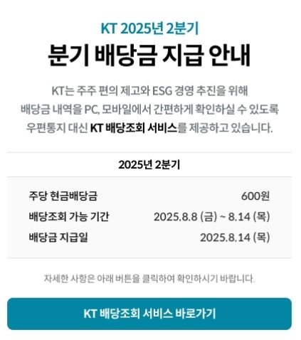 KT는 주주 편의성과 ESG 경영 강화 차원에서 2024년부터 ‘온라인 배당금 조회 서비스’를 운영중이다. 주주들은 8월 8일부터 PC 또는 모바일 기기를 통해 KT 기업 홈페이지(corp.kt.com)에 접속해 간편한 본인 인증 절차를 거치면 2분기 배당 내역을 확인할 수 있다.