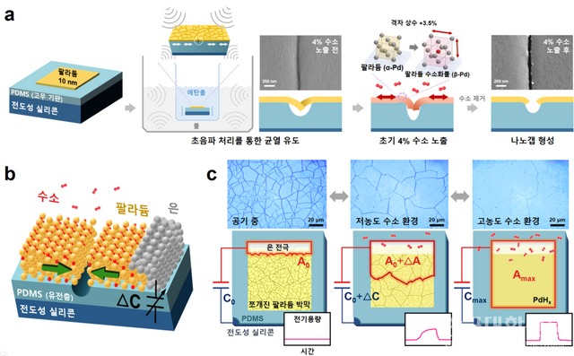 연구팀은 Pd/PDMS/Doped-Si 구조에 초음파 처리를 가해 Pd 박막 표면에 균일한 씨드 균열을 유도하는 새로운 접근법을 제시했다. 이후 수소가 흡착되면 Pd 결정 격자가 팽창해 나노갭이 폐쇄되고, 이를 전기용량 변화로 실시간 감지하는 방식을 적용했다. 이 방법은 기존 공정보다 간단하고 재현성이 높으며, 갭 폭을 20nm 이하로 균일하게 유지할 수 있다는 점이 특징이다.