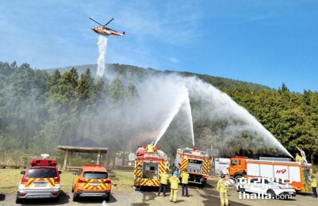 제주 소방당국이 제주시 구좌읍 세화리 다랑쉬오름에서 헬기와 험지용 펌프자 등 특수장비를 동원해 대형 산불을 가정한 진압 훈련을 하고 있다. 한라일보DB