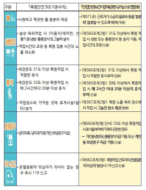 노동자가 체감온도 31도 이상이 되는 작업장소에서 2시간 이상 작업할 경우 사업주는 실내·옥외 구분 없이 냉방·통풍장치 설치·가동, 작업시간대 조정 등 폭염 노출을 줄일 수 있는 조치, 주기적인 휴식부여 중 어느 하나 이상의 조치를 해야 한다.