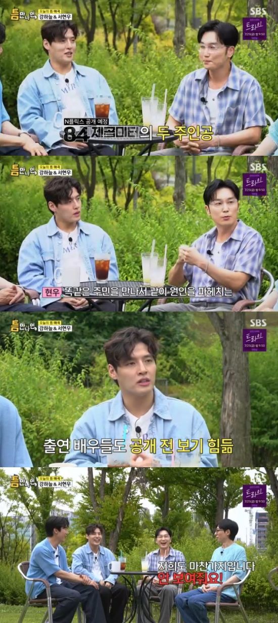 이날 강하늘고 서현우는 곧 공개를 앞두고 있는 영화 '84제곱미터'를 언급했다. 강하늘은 "영혼까지 끌어모아서 겨우겨우 산 집인데, 층간소음이 점점 심해지면서 겪는 일을 담았다. 공포까지는 아니고 현실 스릴러"라고 했다.