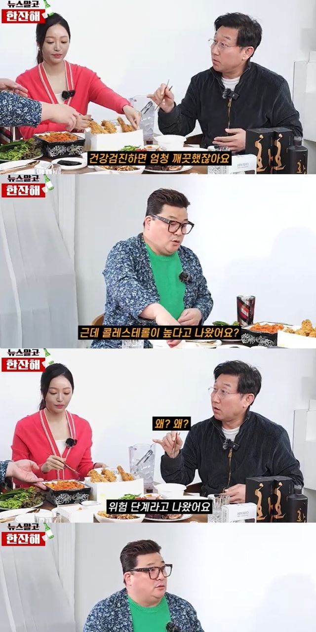 이날 김현욱은 "사실 얼마 전까지만 해도 자랑했던 게, 건강검진 하면 엄청 깨끗했지 않냐. 근데 콜레스테롤이 높다고 나왔냐"며 윤정수의 건강검진 결과를 물었다.