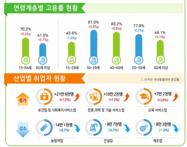 산업별로는 ▲보건업 및 사회복지서비스업(+21만6000명) ▲전문, 과학 및 기술서비스업(+10만2000명) ▲금융 및 보험업(+5만4000명) 등에서 증가한 반면 ▲건설업(-9만7000명) ▲제조업(-8만3000명) ▲농림어업(-14만1000명) 등에서 내려갔다.