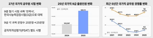한편 2027년부터는 국가직과 지방직 9급 시험에서 모든 과목의 문항 수가 20문항에서 25문항으로 확대된다. 한국사 과목이 제외되면서 신뢰도와 변별력 강화를 위해 공통 및 전문과목 모두 문항이 늘어난 것으로, 이에 따른 수험 전략도 새롭게 수립해야 한다.