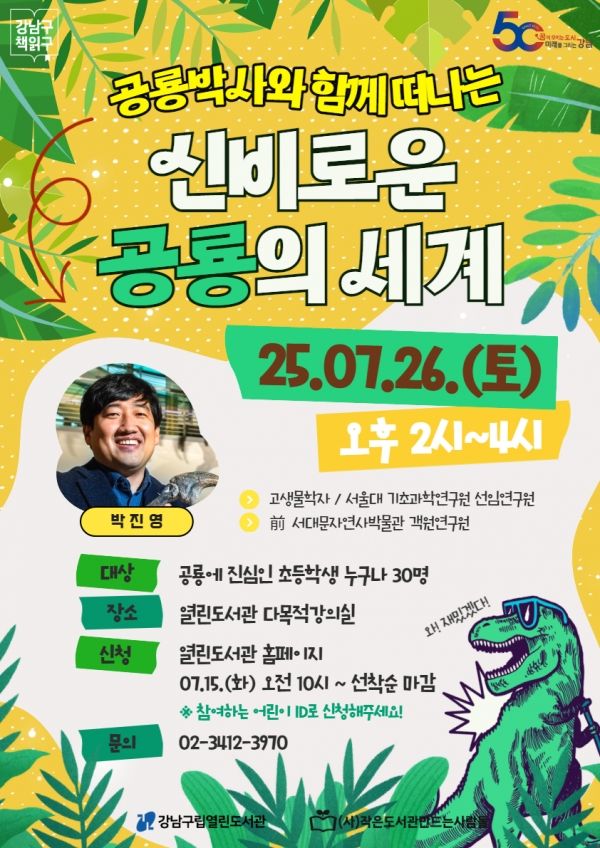 강남구립열린도서관(과장 김상희)이 ‘공룡박사’로 불리는 박진영 박사를 초대해 공룡을 주제로 한 특별 강연을 진행한다.