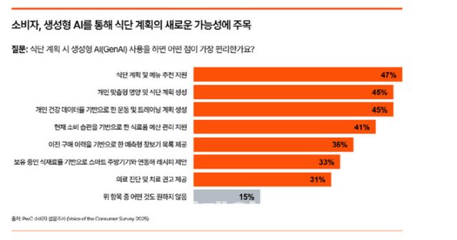 설문에 참여한 소비자들은 보유 중인 식재료를 기반으로 레시피를 추천받거나, 이전 구매 이력을 바탕으로 장보기 목록을 자동 생성하는 기능에 대해 편안함을 느끼고 있다고 응답했다. 보고서는 “식품, 건강, 기술이 통합된 생태계에 대한 수요는 점차 확대되고 있으며, 기업은 AI와 디지털 기술을 활용해 소비자와 접점을 강화할 수 있는 기회를 맞이하고 있다”고 평가했다.