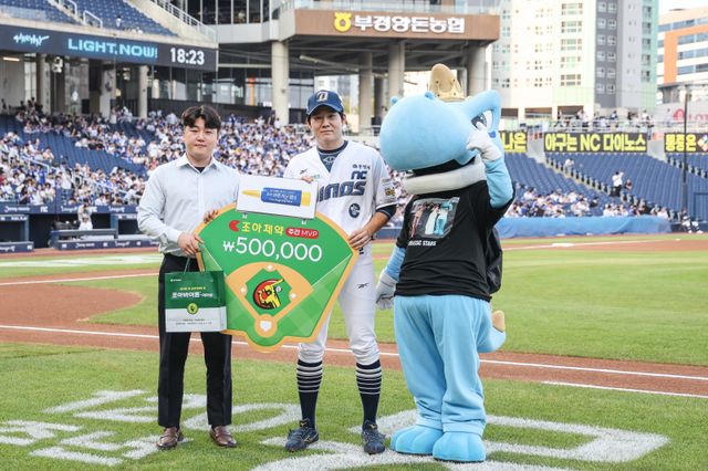 시상은 지난 8일 창원 삼성 라이온즈전에 앞서 열렸고, 조아제약 경남영업소 전형근 사원이 맡았다.