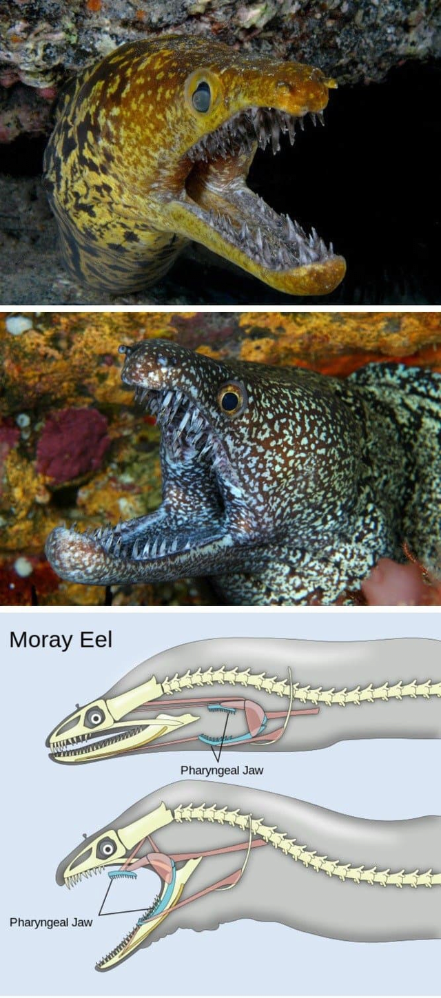 곰치가 이 인두악을 쭉 내밀었다가 끌어들이는 모습은 마치 또 다른 턱이 튀어나오는 것처럼 보인다.