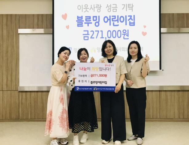 공공형이자 열린 어린이집인 블루밍어린이집이 이번에 기탁한 성금은 원아 및 학부모, 교직원들이 함께 참여하여 장난감, 책, 야채, 과일 등을 사고 파는 '시장놀이'체험활동에서 발생한 수익금이다.