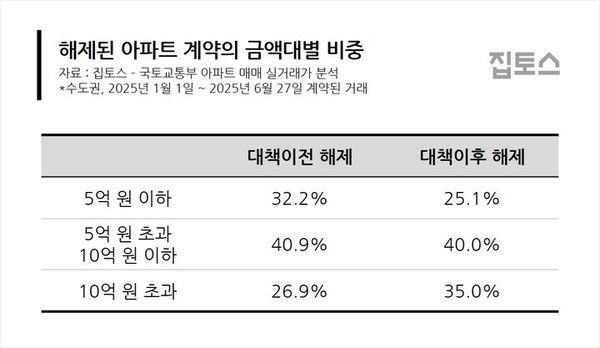 6월27일 전에 해제된 계약의 경우 10억원 초과 아파트가 차지하는 비중이 26.9%였으나 8.1%p 오른 것이다. 반면 5억원 이하 아파는 32.2%에서 25.1%로, 5억원 초과 10억원 이하 아파트는 40.9%에서 40%로 줄었다.