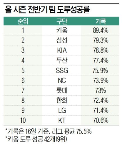 키움의 올 시즌 전반기 팀 도루성공률은 리그 1위. 하지만 도루 개수가 42개(1위 NC 다이노스·102개)로 9위였다. 이마저도 송성문의 점유율이 28.6%(12개)로 높았다. 도루 시도가 리그에서 가장 적으니 높은 성공률의 의미가 퇴색하기도 했다. 설종진 감독대행이 주목하는 것도 바로 이 부분이다. 강점(도루·작전)을 강화해 약점(타율·출루율·장타율)을 보완할 계획이다. 다만 설종진 감독대행이 이끈 키움 2군인 고양 히어로즈의 팀 도루가 2군 11개 팀 중 10위였다. 경기 양상이 더 빡빡한 1군에서 작전 구사를 얼마나 할 수 있을지는 좀 더 지켜볼 필요가 있다. 한 구단 관계자는 "구단 특성상 벤치에서 얼마나 작전 사인을 낼 수 있을까 흥미롭다"라고 말했다.
