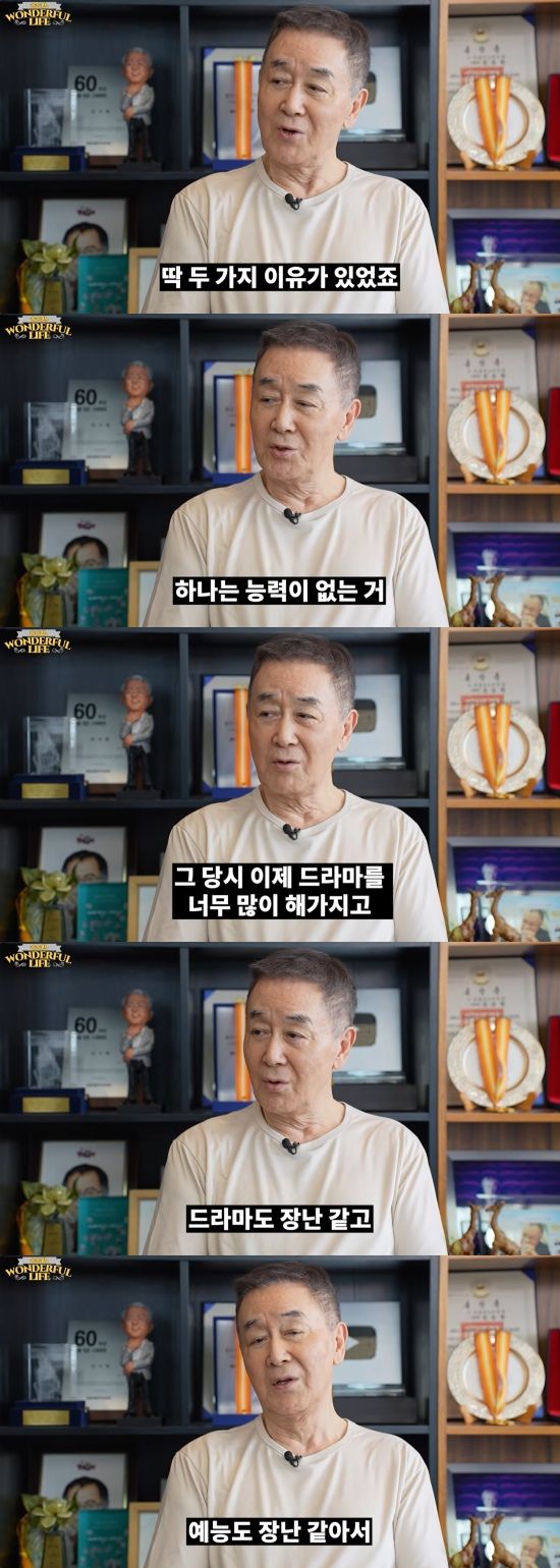그는 "하나는 능력이 없는 거고, 또 하나는 그 당시 이제 드라마를 너무 많이 해가지고, 에능까지 나가면 드라마도 장난 같고 예능도 장난 같아서 안 나갔었다. 지금 와서 생각하면 그게 잘한 건지 못한 건지 모르겠다"고 털어놨다.