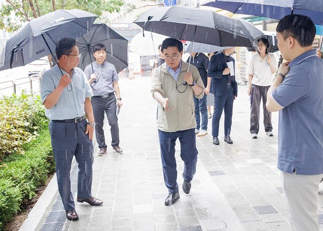 이날 진 구청장은 보수 공사가 제대로 이뤄졌는지, 최근 내린 비로 인한 보도 침하나 물고임 현상은 없는지 등 일대를 직접 걸으며 현장을 꼼꼼히 살폈다.