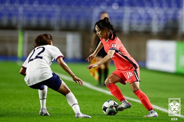 한국이 후반전 시작과 함께 교체 카드를 꺼냈다. 케이시, 추효주 대신 강채림, 문은주가 투입됐다. 한국이 절호의 찬스를 놓쳤다. 후반 2분 문은주가 내준 크로스를 문전에 있던 정다빈이 슈팅으로 연결했는데 빗나갔다.
