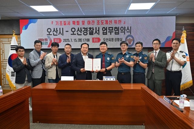 [와이뉴스] 오산경찰서(서장 윤주철)는 “7월 15일, 오산시와 기초질서 확립 및 야간 조도개선을 위한 협약을 체결해 일상생활 주변 공동체의 신뢰를 저해하는 기초질서 미준수 관행을 개선하고, 안전한 밤거리를 조성하여 오산시민이 행복한 사회를 견인하겠다”고 밝혔다.