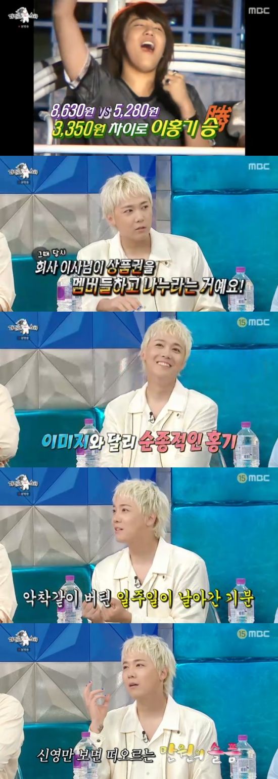 이홍기는 "그 당시 소속사 이사님이 '만원의 행복' 우승 선물로 받은 상품권을 멤버들과 나누라는거다. 너무 화가났지만, 나눴다. 그래서 신영이 누나만 보면 그 때가 생각이 난다"면서 웃었다.