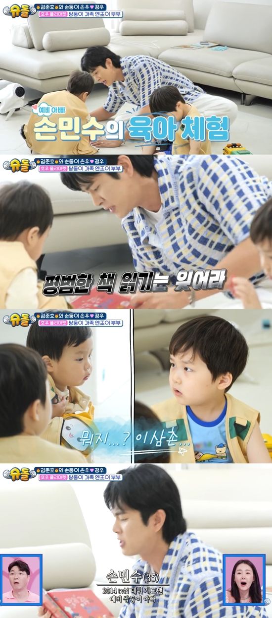 임라라가 옷을 둘러보는 사이 손민수가 은우와 정우를 담당했다. 이에 최지우는 "예비 아빠 민수 씨 육아 체험 괜찮을까?"라며 우려를 표했다. 손민수는 혼신의 연기력을 동원해 책을 읽어 나갔다.
