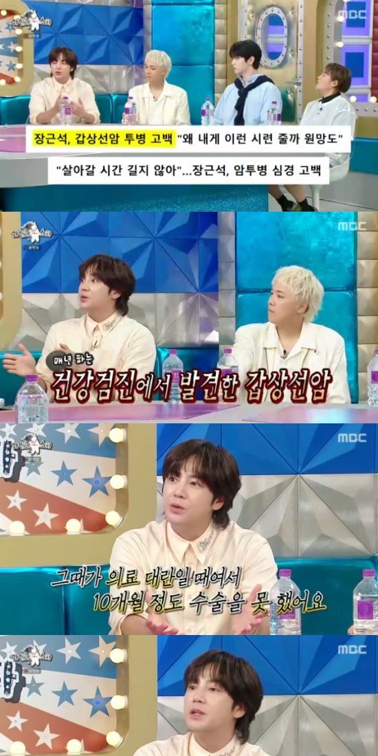 이날 데뷔 33년차 된 장근석은 '라디오스타'에 처음 출연했다. 출연을 결심한 이유를 묻자 장근석은 "작년에 갑상선암으로 투병했다. 제가 1년에 한 번씩 꼭 건강검진을 받는데, 아주 작은 크기일 때 발견을 했다"고 말했다.