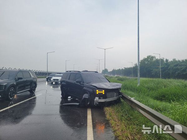 전날 오후 1시께 파주시 문발동 자유로에서 스포츠유틸리티차량(SUV)이 빗길에 미끄러져 도로 옆 구조물을 들이받았다.