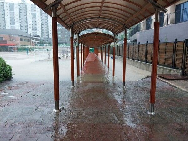 청주 운천초등학교 운동장도 물에 잠겼다. 학교 측은 양수기를 동원, 빗물을 모두 퍼내 학사 일정은 정상적으로 이뤄지고 있다.