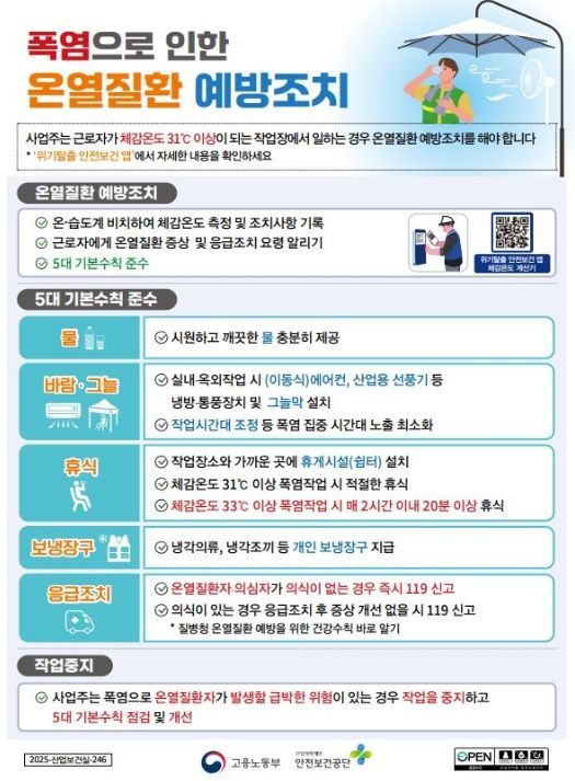 합동점검팀은 17개 언어로 제작한 고용노동부 '폭염안전 5대 기본수칙' 등을 외국인 근로자와 사업주에게 제공하고 현장 적용 여부를 확인한다. 특히, 체감온도 33도 이상 폭염 시 ‘2시간마다 20분 이상의 휴식’ 의무화 등 강화된 작업운영 지침을 적극 설명할 예정이다.