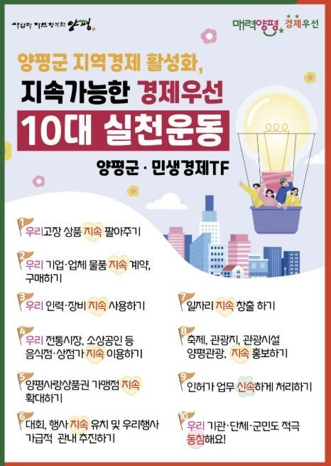 특히, 경제 활성화를 위한 부서 의견 공유 회의를 통해 도출된 ‘양평형 경제우선 10대 실천운동’을 중심으로 군민, 기관·단체가 함께 참여할 수 있는 생활밀착형 경제 활성화 정책을 수립하고 추진할 계획이다.