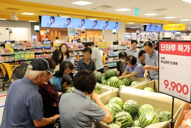 17일 아침 이른 시간부터 서울 이마트 매장 앞에 100여 명의 시민들이 줄을 서는 진풍경이 벌어졌다. 이들의 목적은 하나, 바로 9900원에 판매되는 수박이었다. 평소 3만 원을 넘나드는 수박을 3분의 1 가격에 살 수 있다는 소식에 폭우를 뚫고 고객들이 몰려든 것이다.