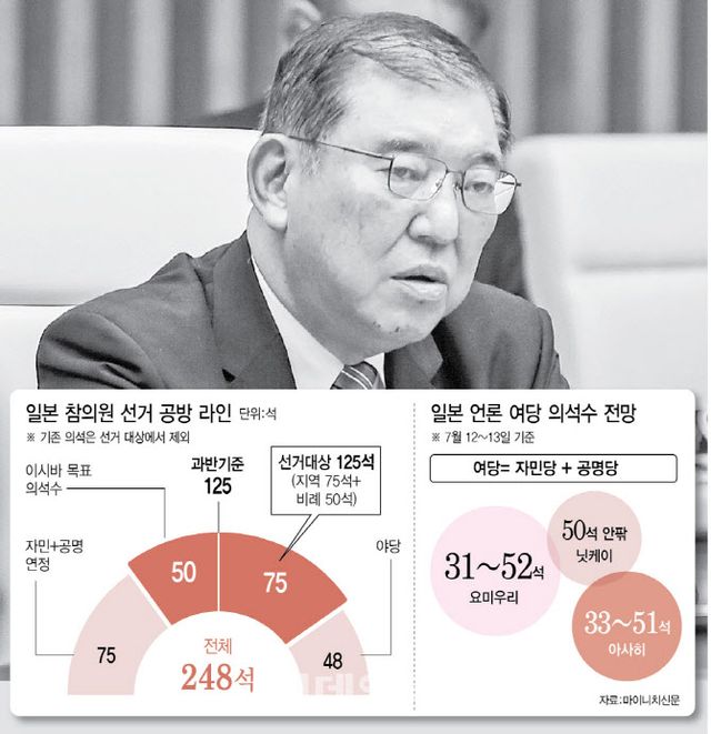 [이데일리 정다슬 기자] 오는 20일(현지시간) 일본 참의원(상원) 선거가 3일 앞으로 다가온 가운데, 여당이 과반 의석을 확보하지 못할 것이란 전망이 힘을 얻고 있다. 작년 중의원(하원) 선거에서 패해 여소야대 상황에 놓인 이시바 시게루 일본 내각이 참의원 선거마저 패하면 정권 붕괴 위기로 치달을 것이란 분석이 나온다.