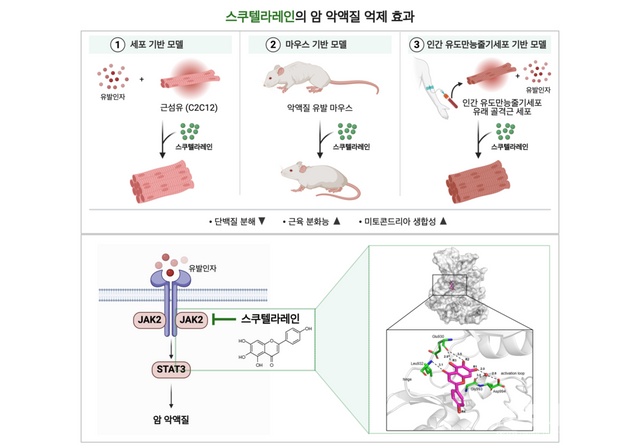 마우스와 인간 근육세포 모델에서 스쿠텔라레인을 처리했을 때 근육 단백질 분해가 억제되고 근섬유 크기가 회복됐으며, 암 악액질을 유도한 두 종류의 동물 모델에서도 근육 소실이 유의미하게 감소하고 근력과 근기능이 개선됐다.