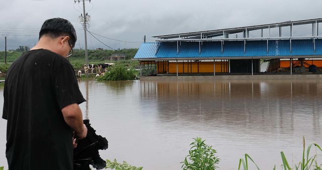 기록적인 폭우가 내린 17일 충남 예산군 고덕면 용리에서 농장주가 침수된 우사를 바라보고 있다. / 뉴스1