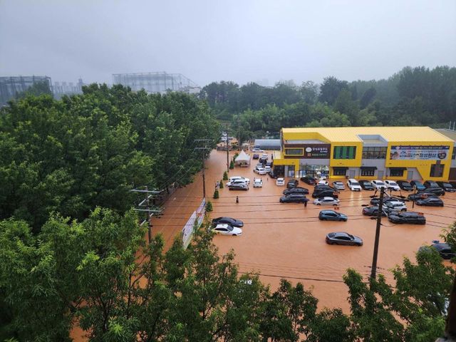폭우가 쏟아진 17일 전남 장성로컬푸드 일대 도로와 주차장이 침수돼 주민들이 대피하고 있다. / 뉴스1(독자 제공.