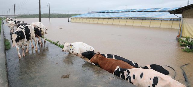 기록적인 폭우가 내린 17일 충남 예산군 고덕면 용리에서 침수된 우사에서 소들이 탈출하고 있다. / 뉴스1