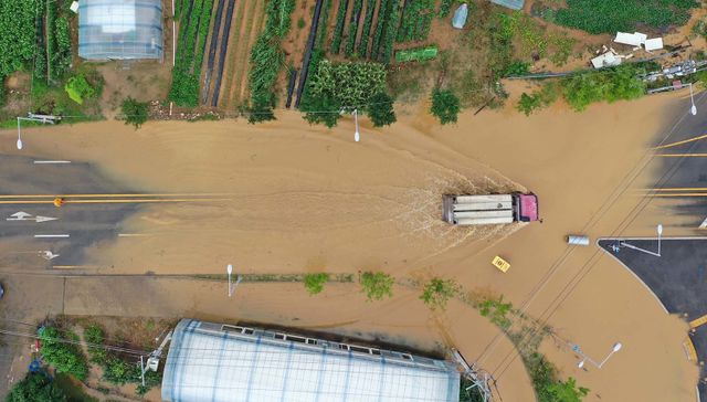 경기지역 곳곳에서 기록적 폭우가 내린 17일 경기 시흥시 정왕동 마전봉화교차로 일대 침수된 도로로 덤프트럭이 지나가고 있다. / 뉴스1