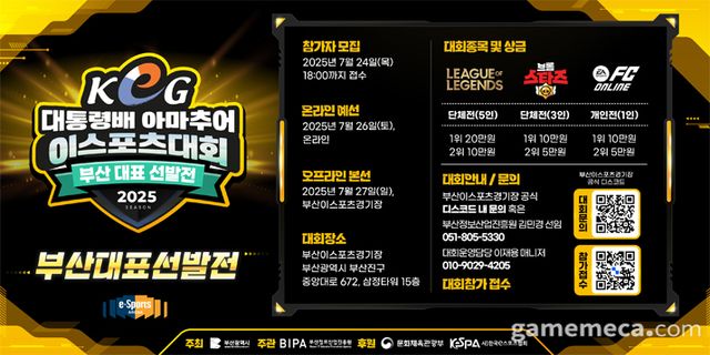 참가 신청은 7월 24일까지 받으며, 종목은 리그 오브 레전드(5인 단체전), 브롤스타즈(3인 단체전), FC 온라인(개인전)이다. 단체전은 각 1위팀, 개인전은 1·2위 선수에게 부산 대표 자격이 주어진다. 지역 연고 제한은 없지만, 다른 지역 KeG 대표 선발전과 중복 참여는 불가능하다.