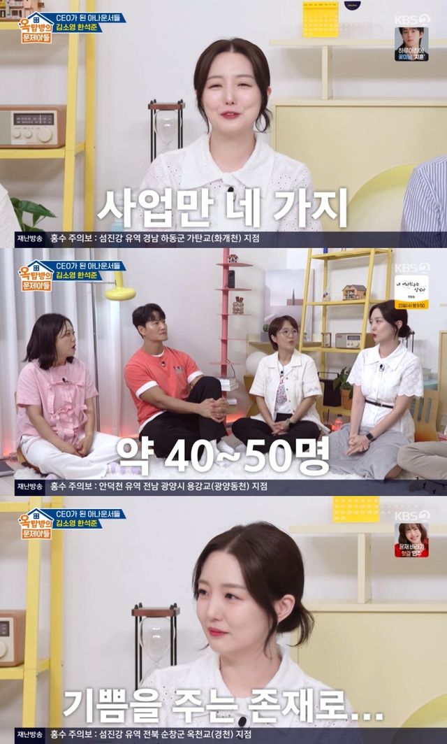 현재 사업은 승승장구해 직원만 약 50명이라고. 김소영은 "퇴사 후 즐겁게 살고 싶어서 퇴직금으로 사업을 시작했다"며 "힘들지만 즐거워서 계속 하게 됐다"고 밝혔다.