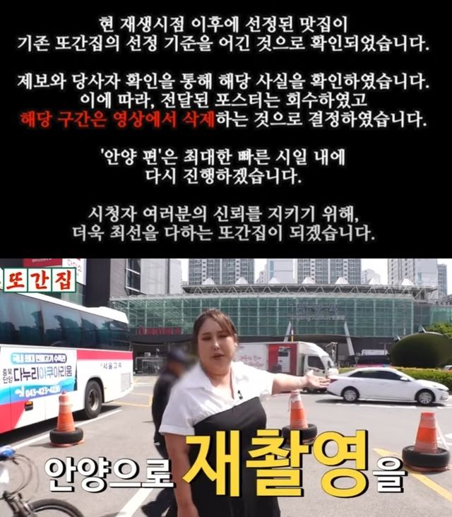 이와 관련 '또간집'은 "안양 편에서 1등으로 선정된 맛집이 또간집 선정 기준을 어긴 사례가 확인됐다"며 "이에 따라, 전달된 포스터는 회수하였고 해당 영상은 영구 삭제하기로 결정했다"고 사과했다.