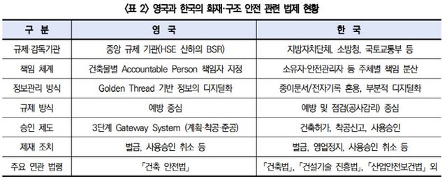 한국의 화재·구조 안전 관련 현행법은 이와 비교해 △안전 감독기관 및 책임 구조 △정보관리 방식 △승인제도에 따른 단계별 사업 추진 요건 등에서 차이를 보인다는 분석이다. 우리나라 건설기술 진흥법과 산업안전보건법에 따르면 규제·감독기관이 분산돼 있고 우리나라 착공단계 승인 관리는 허가제보다는 신고제에 가깝다.