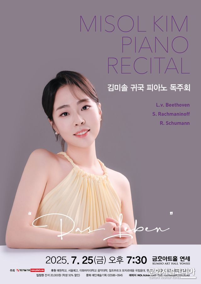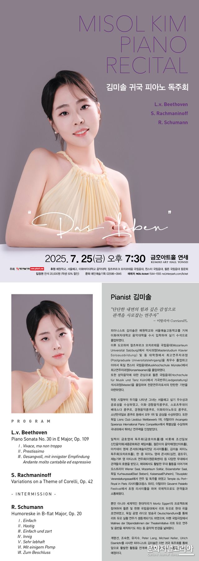 한편 계명선, 조숙현, 유지수, Peter Lang, Michael Keller, Ulrich Eisenlohr를 사사한 피아니스트 김미솔은 이번 귀국 독주회를 통해 앞으로 활발한 활동을 전개해 나가며 관객들과 소통을 이어갈 예정이다.