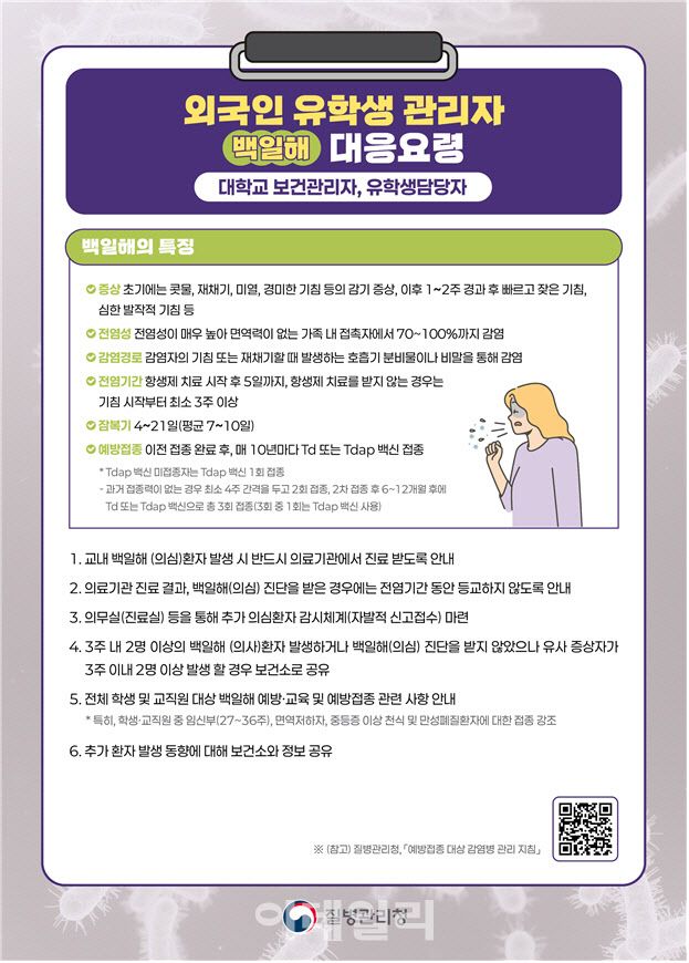 이에 질병청은 예방 및 초기 대응을 위해 관련 안내서를 제작한 것이다. 이번에 배포하는 대응요령에는 대학 내 집단발생 가능성이 높은 호흡기 감염병인 결핵, 홍역, 백일해의 특징과 예방법, 의심 환자 발생 시 조치 및 보고 등을 한눈에 파악해 현장에서 적용할 수 있도록 했다.