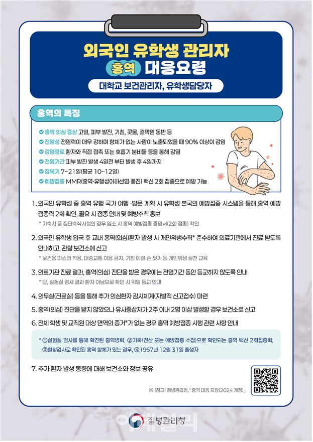 임승관 질병청장은 “감염병 상황에서 가장 먼저 대응하게 되는 대학 보건관리자의 역할이 무엇보다 중요하다”며 “이번 행동요령이 외국인 유학생 대상 감염병 예방 및 초기대응에 실질적인 도움이 되기를 바란다”고 말했다.