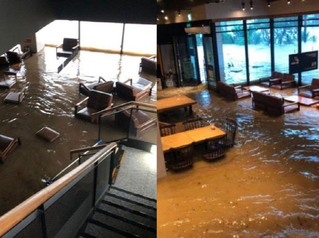 해당 사진에는 매장 1층이 흙탕물에 잠겨 손님들이 이용하는 의자와 테이블이 물 위에 둥둥 떠 있는 모습이 담겼다. 계단 일부까지 물이 차올라 사진 촬영자는 2층으로 대피한 것으로 보인다. 매장 앞 도로 역시 전면 침수된 상태였다.