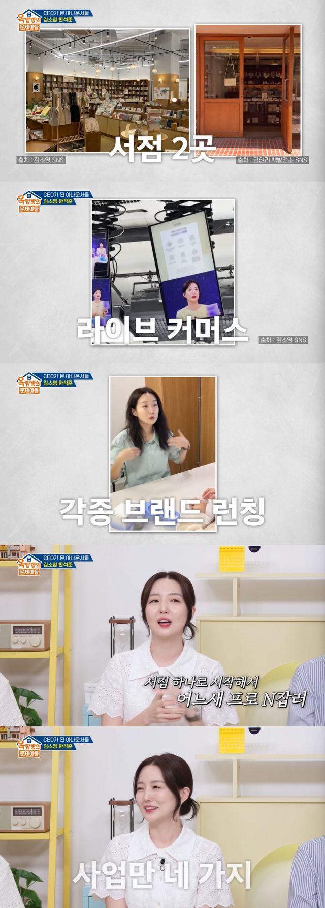 이날 김소영은 "서점 2곳을 하고, 라이브 스타일 커머스 쇼핑몰, 건강기능 식품, 스킨케어 브랜드를 하고 있다"고 근황을 전했다.