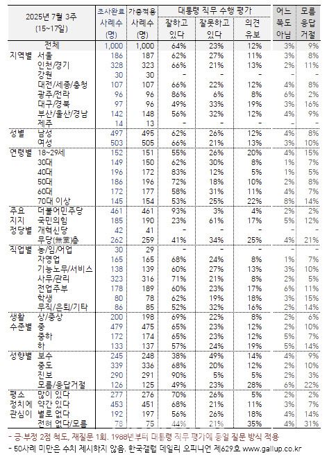 이번 조사는 7월 15일부터 17일까지 사흘간 이동통신 3사가 제공한 무선전화 가상번호를 무작위로 추출해 전화조사원이 직접 응답을 받는 방식으로 진행됐다. 응답률은 12.8%, 표본오차는 95% 신뢰 수준에서 ±3.1%포인트다. 여론조사 결과의 자세한 내용은 한국갤럽과 중앙선거여론조사심의위원회 누리집을 참조하면 된다.