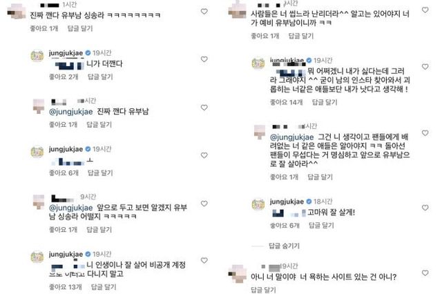 이에 적재는 “네가 더 깬다”고 답글을 달았다. 그러자 A씨가 “진짜 깬다. 유부남”이라고 재차 적었고, 적재는 손가락 욕을 암시하는 모음을 적으며 불쾌감을 드러냈다.