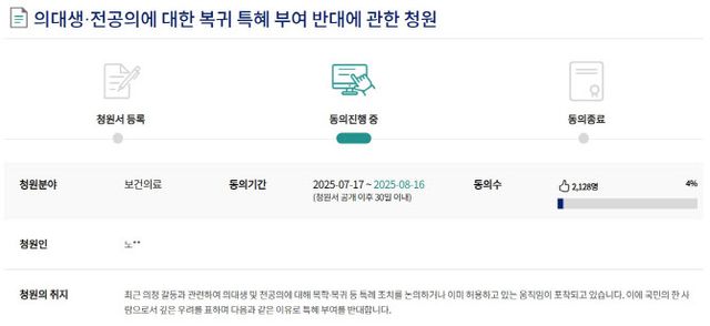 작성자 노모씨는 “최근 의정 갈등과 관련해 의대생·전공의에 복학·복귀 등 특례 조치를 논의하거나 이미 허용하고 있는 움직임이 포착되고 있다”고 청원 취지를 밝혔다.