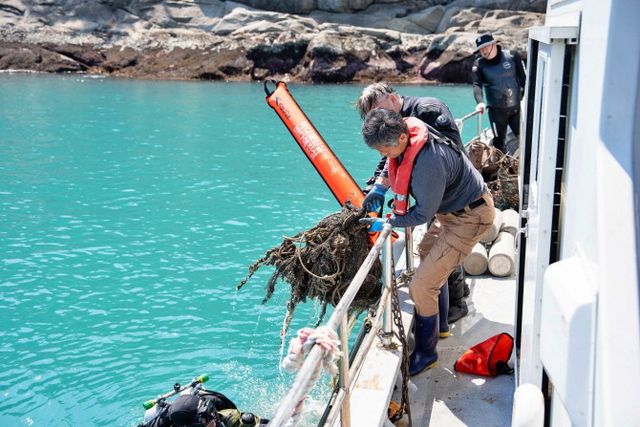 17일 전라남도 여수시 돌산 진목방파제 연안에서 수중 정화 작업을 진행하는 모습. 전문 스쿠버가 바다 속에서 수거한 폐그물을 끌어올리고 있다. © 롯데쇼핑