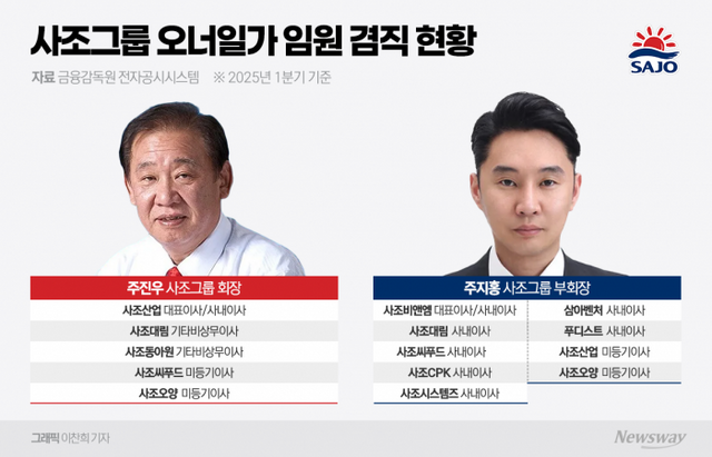주 회장은 사조산업 대표이사로 상근하면서 사조대림·사조동아원 기타비상무이사, 사조씨푸드·사조오양 미등기 임원으로 등재된 상태다. 주 부회장의 경우 사조비앤엠 대표이사와 사조대림·사조동아원·사조씨푸드·사조CPK·사조시스템즈·삼아벤처·푸디스트 등 7개사의 사내이사, 사조산업·사조오양 미등기이사로 총 10개 계열사의 이사회에 개입하고 있다.