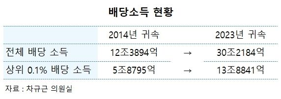 차규근 조국혁신당 의원이 국세청에서 받은 ‘배당소득 1000분위 현황’ 자료에 따르면 2023년 귀속분 주식 배당소득은 30조2184억원이다. 2014년(12조3894억원)에 비해 2.4배 증가했다. 배당을 1원이라도 받은 주식 보유자는 2014년 842만9712만명에서 2023년 1746만4948만명으로 2배 이상 늘었다.